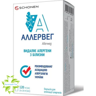 Для найкращого результату нейтралізації алергенів рекомендовано поєднувати обробку зон скупчення інгаляційних алергенів АЛЛЕРВЕГ спреєм з використанням АЛЛЕРВЕГ емульсії для елімінації алергенів, що видаляє з тканин, речей та білизни алергени, зокрема кліщів домашнього пилу та паразитів (бліх, вошей, постільних клопів, коростяних кліщів та кліщів обличчя роду Демодекс/Demodex).