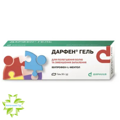 Дарфен® Гель - комбінований препарат для зовнішнього застосування, що містить ібупрофен з ментолом природного походження. Ібупрофен, похідна сполука фенілпропіонової кислоти, є представником групи нестероїдних протизапальних засобів (НПЗЗ), має знеболювальну, протизапальну дію, зумовлену пригніченням простагландинсинтетази. Дія левоментолу, оптичного ізомеру ментолу, зумовлена рефлекторними реакціями, що пов'язані з подразненням чутливих нервових закінчень шкіри. Ментол стимулює ноцицептори шкіри. У результаті відбувається вивільнення пептидів, які мають судинорозширювальну дію. Лікарський засіб чинить відволікаючу та подразнювальну дію, а також полегшує біль.