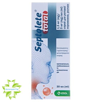 Перед першим застосуванням Септолете® тотал або якщо спрей не застосовували протягом тривалого періоду часу (принаймні 1 тиждень), слід натиснути на дозуючий пульверизатор кілька разів для отримання рівномірного розпилення.
