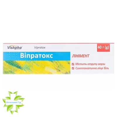 1 г лініменту містить отрути гюрзи 16 МОД 0,0176 мг, саліцилової кислоти 10 мг, камфори рацемічної 30 мг, ялицевої олії 30 мг;
