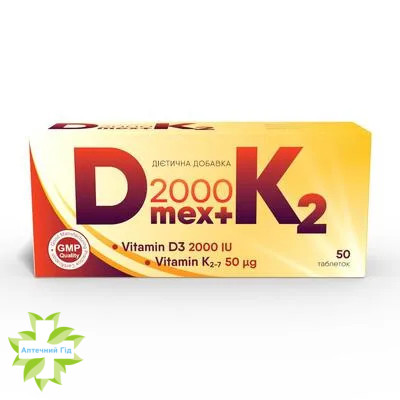 Также мы можем доставить Витамин Д МЭКС 2000 + К2 таблетки 2000 МЕ Д3 и 50 мкг витамина К2 курьером по Киеву.