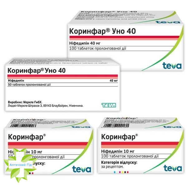 Таблетки Коринфар 10 мг пролонгованої дії, вкриті плівковою оболонкою (тобто з низькою дозою ніфедипіну), призначаються насамперед пацієнтам з артеріальною гіпертензією з тяжким цереброваскулярним захворюванням, а також пацієнтам з надмірною чутливістю до ніфедипіну, з недостатньою масою тіла або пацієнтам, що застосовують антигіпертензивні препарати.