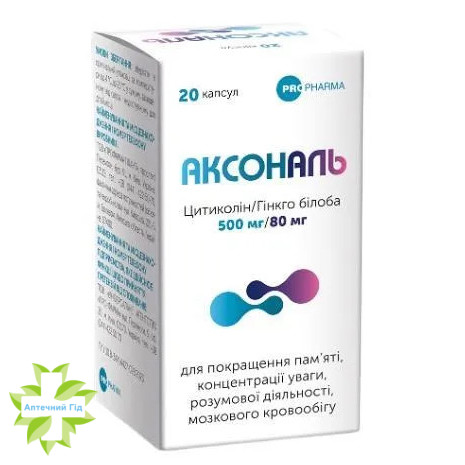 АКСОНАЛЬ може бути рекомендована в якості дієтичної добавки до раціону харчування як додаткове джерело цитиколіну, біофлавоноїдів, флавоноїдних глікозидів (кверцетин, кемпферол, ізорамнетин), терпенових трилактонів, органічних кислот, проантоцианідів.