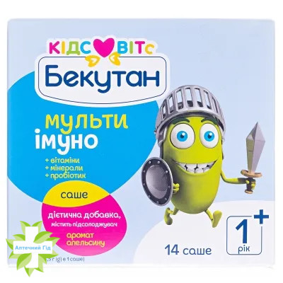 Бекутан Кідс Витс Мультиімуно є дієтичною добавкою з ароматом апельсина, що містить комбінацію вітамінів, мінералів і пробіотик. Продукт являє собою подвійне саше з двома окремими відсіками. Кожен відсік містить окремий порошок. Обидва порошки повинні розчинятися одночасно. Один відсік містить порошок з вітамінами і мінералами (порошок А), в іншому міститься пробіотик Lactobacillus rhamnosus GG (порошок Б).