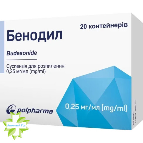 Бенодил містить потужний негалогенізований кортикостероїд - будесонід, призначений для лікування бронхіальної астми у пацієнтів, для яких застосування інгаляторів з розпиленням лікарських речовин стиснутим повітрям або у вигляді лікарської форми сухого порошку є неефективним або недоцільним.