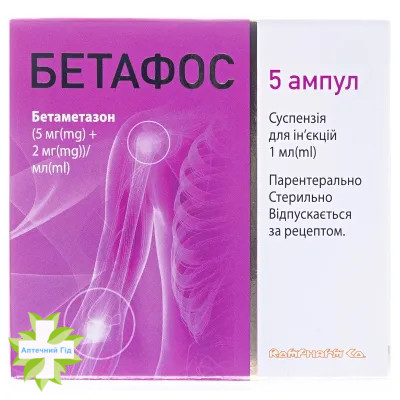 До складу препарату Бетафос входить два ефіри бетаметазону, один з яких - бетаметазону натрію фосфат - швидко всмоктується з місця ін'єкції. Тому слід враховувати, що ця розчинна складова препарату Бетафос може мати системний вплив.