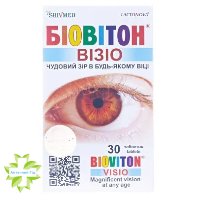 Біовітон Візіо - оригінальна комбінована формула, яка сприяє нормальному функціонуванню зорового апарату, запобігає розвитку дегенерації сітківки, глаукоми, уповільнює розвиток катаракти і зниження гостроти зору, пов'язаних з віковими змінами.