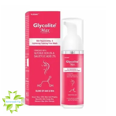 Пінка для обличчя ГЛІКОЛАЙТ МАКС / GLYCOLITE MAX містить Sodium Lauryl Ethyl Sulphate, Glycolic Acid, Cocamidopropyl Betaine, Propylene Glycol, Salicylic Acid, Triethanolamine, Perfume, DPanthenol, DMDM Hydantoin, Ethy and Water.