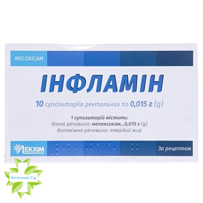 Селективність інгібування ЦОГ-2 мелоксикамом підтверджена багатьма дослідниками як in vitro, так і ex vivo. Інфламін (15 мг) переважно інгібує ЦОГ-2 ex vivo, що підтверджується більшим інгібуванням продукції PGE2 у відповідь на стимуляцію ліпополісахаридом порівняно з продукцією тромбоксану у згорнутій крові (ЦОГ-1). Ці ефекти - дозозалежні. Інфламін не впливає на агрегацію тромбоцитів або на час кровотечі при застосуванні рекомендованих доз ex vivo, тоді як індометацин, диклофенак, ібупрофен і напроксен значно інгібують агрегацію тромбоцитів і подовжують кровотечу.