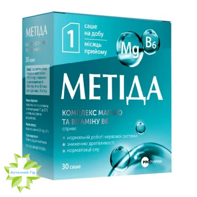 Метида рекомендується з метою нормалізації функціонального стану нервової системи при незбалансованому харчуванні або підвищеної потреби в магнії і вітаміні В6 при негативному впливі довкілля, надмірних фізичних і психічних навантаженнях, вагітності, при підвищеній втомлюваності або слабкості, порушення сну, дратівливості, підвищеній збудливості, тривожності, м'язових судомах, відчутті поколювання в м'язах.