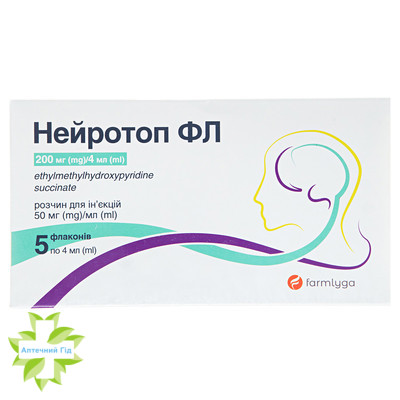 Всмоктування. При введенні лікарського засобу Нейротоп ФЛ у дозах 400-500 мг максимальна концентрація (Сmax) у плазмі крові становить 3,5-4,0 мкг/мл і досягається протягом 0,45-0,5 години.