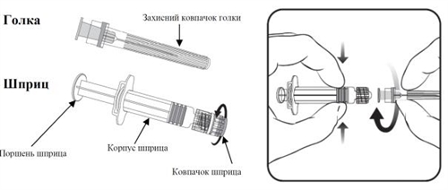 2. Для того, щоб приєднати голку до шприца, вкручуйте голку, обертаючи її за часовою стрілкою, доки не відчуєте її закріплення (див. малюнок).