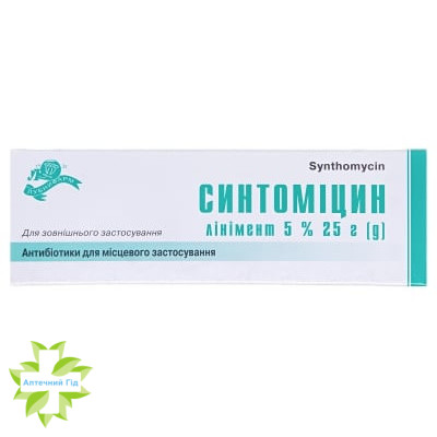 діюча речовина: 1 г лініменту містить хлорамфеніколу (синтоміцину) - 50 мг;