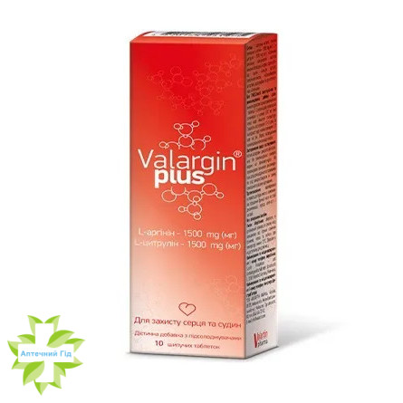 Валаргін® ПЛЮС може бути використаний у якості дієтичної добавки до раціону харчування як додаткове джерело амінокислот L-аргініну та L-цитруліну, які приймають участь у синтезі білка та протеїну в організмі людини. Крім того, амінокислоти L-аргінін та L-цитрулін є основним джерелом оксиду азоту (NO) в організмі людини, які синтезуються на клітинному рівні та, проникаючи через мембрани клітини, насичують клітини та тканини киснем.