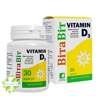 | Купити Ціна 101,00 грн ВітаВіт Вітамін D3, капсули по 1000 МО, №30 |