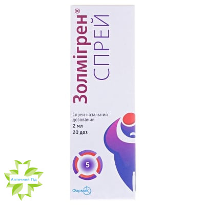 Абсорбція. Золмітриптан при назальному застосуванні швидко абсорбується в носоглотці, що було підтверджено дослідженням позитронно-емісійної томографії з використанням радіоактивного [карбоніл-11C] золмітриптану. Середня відносна біодоступність препарату Золмігрен® спрей становить 102 % порівняно з пероральним застосуванням золмітриптану у формі таблетки. У здорових добровольців після застосування разових та багаторазових інтраназальних доз золмітриптан та його активний метаболіт N-десметил-золмітриптан мають пропорційно залежні від дози площу під фармакокінетичною кривою «концентрація-час» (AUC) і максимальну концентрацію (Cmax) у діапазоні доз від 1 до 5 мг. У середньому 40 % Cmax від вихідного золмітриптану досягається протягом 15 хвилин. Поява активного метаболіту N-десметил-золмітриптану в плазмі крові, який частково утворюється за рахунок метаболізму першого проходження, затримується на 15−60 хвилин після прийому дози. Золмітриптан визначається в плазмі крові через 5 хвилин, а час досягнення його максимальної концентрації (Тmax) становить 3 години. Після застосування препарату його терапевтична концентрація в плазмі крові підтримується протягом 4−6 годин. При повторному застосуванні кумуляції препарату не спостерігається.